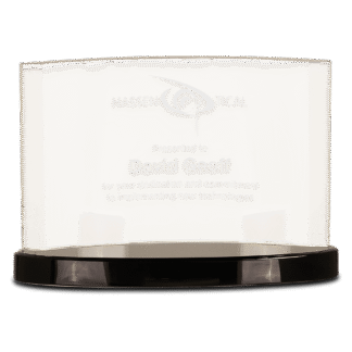 Engraved Personalized Clear Crystal Dome on Blue Pedestal Base.