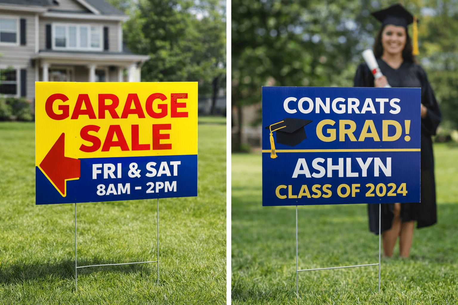 Corrugated yard signs are an economical means for showcasing your garage sale or events. Their affordability allows everyone to promote their activities without breaking the bank. Order yours today, fast turnaround