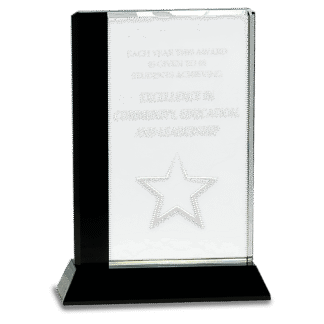 Engraved Personalized Crystal Cylinder on Blue Pedestal Base.