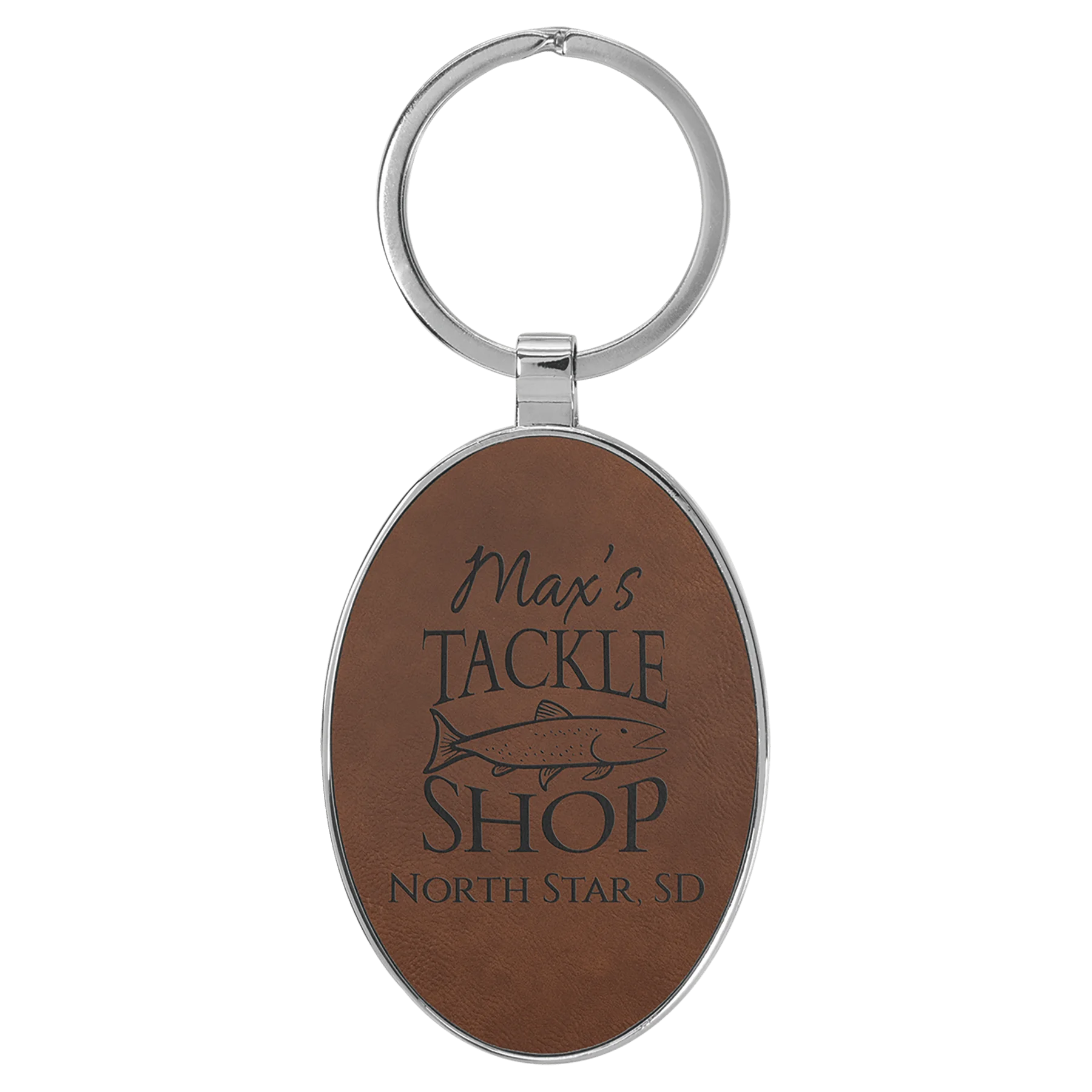 3″ x 1 3/4″ Laserable Leatherette/Metal Dark Brown Oval Keychain