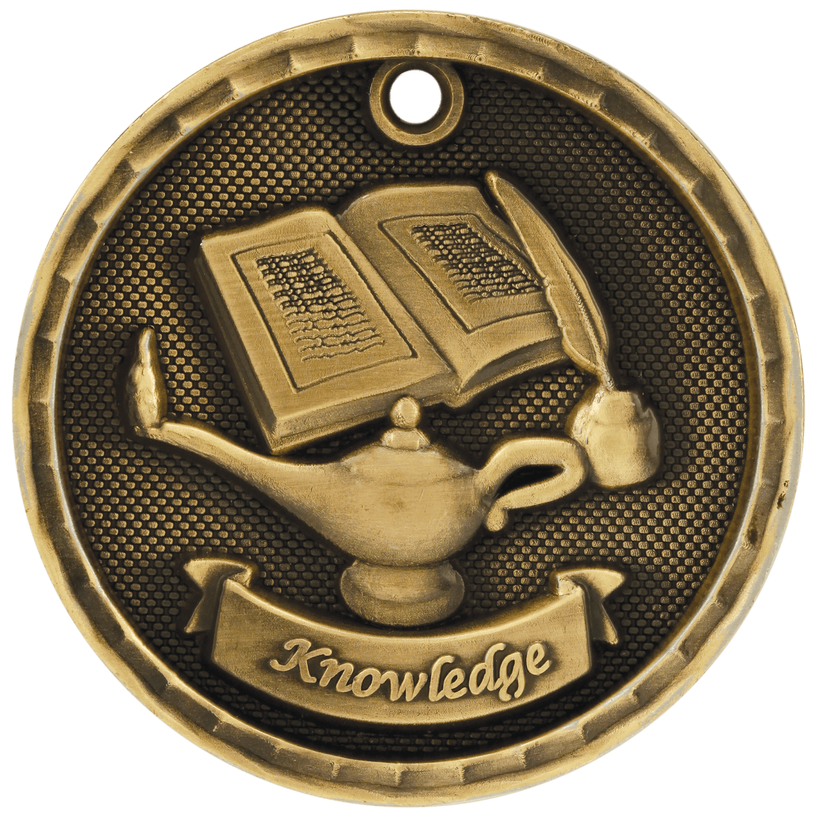 Engraved Personalized Lamp of Knowledge 3-D Medal-Gold – custom made just for you.Add your name, logo, or message.Fast local production from Trophies Etc.